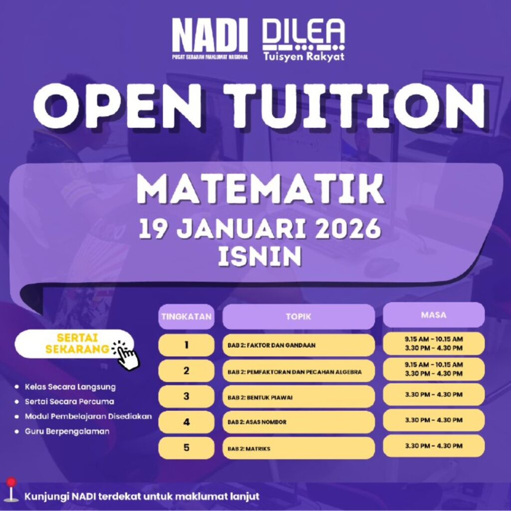 Jom sertai Open Tuition bersama NADI DILEA Tuisyen Rakyat! Kelas ini adalah PERCUMA dan dikendalikan secara langsung!